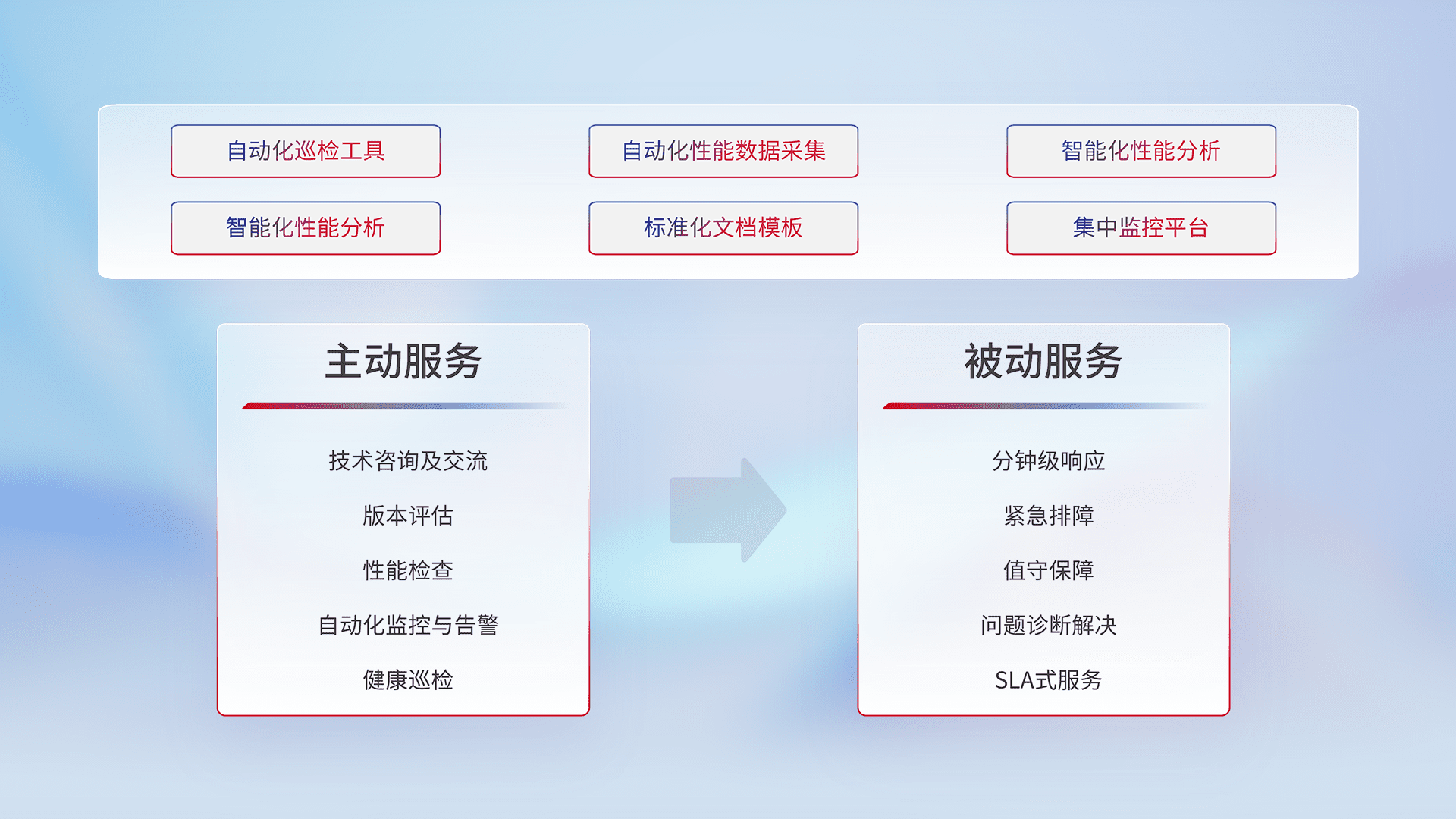 智能化工具和标准化文档,,,保障服务质量,,,提供主动服务(包含技术咨询、、版本评估、、、性能检查、、自动化监控与告警、、健康巡检)和被动服务包含(分钟级响应、、紧急排障、、、、值守保障、、、问题诊断解决、、、、SLA服务)。。