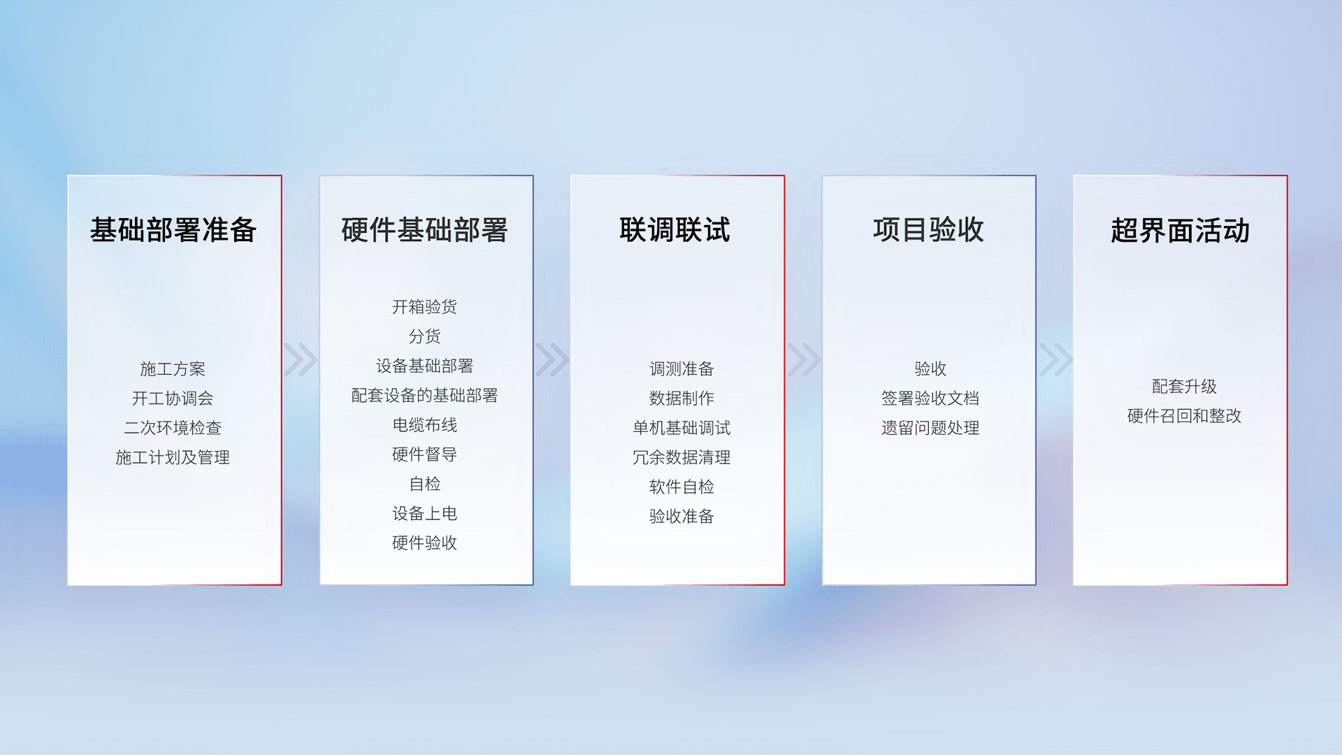 从基础部署准备、、硬件基础部署、、联调联试、、项目验收、、、、越界面活动的全过程可追溯,,,保证施工质量和进度。。